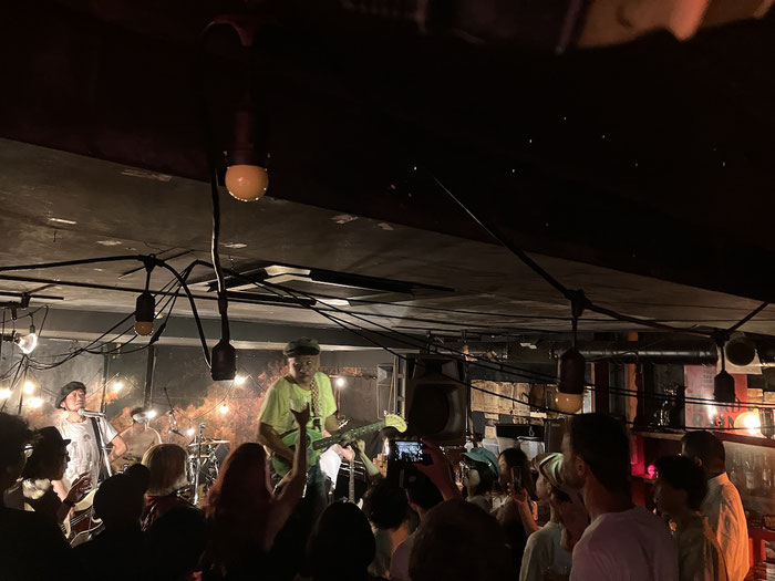 ほんでライブ会場のBIOTOUPに到着。とりあえず水餃子2人前と酒を注文、満腹中枢崩壊させながら屋上でゆっくりする。