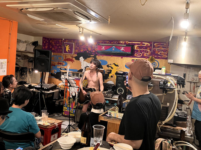 大阪のご長寿シドビシャスこと市村くん、全裸で頑張ってた。江戸時代の歌舞伎みたいに、ライブハウスで演奏する人全員全裸なったらちょっとでもお客増えるのに。我々空空クラブは洋服着て楽にカラオケ歌ってお金もらいました、すんません。またいつか全裸でやります。