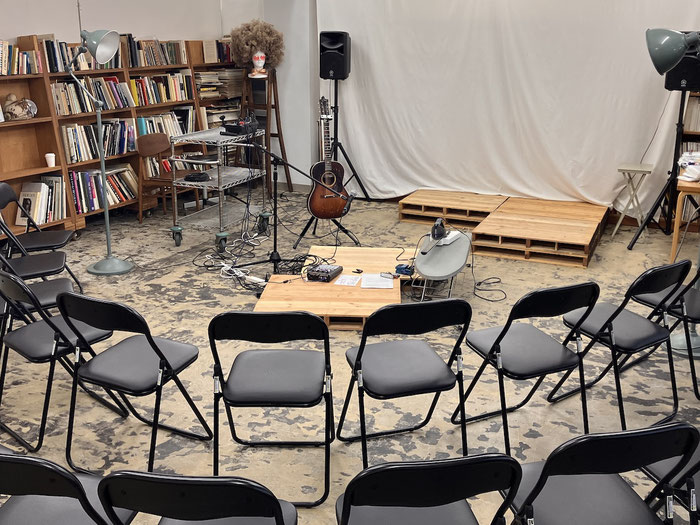 ほんで抜髪Ⅱライブ準備。木のパレットが後ろにあんなに余ってるなら、もっと舞台を高くしとけば後ろの席の人も見やすかったんにな、イマジネーションが働いてなかった。オルガン座のゴトウさんだったらちゃんと全ての座席に腰を下ろして席や舞台の高さを調整してただろうなと、写真見ながら今更反省。